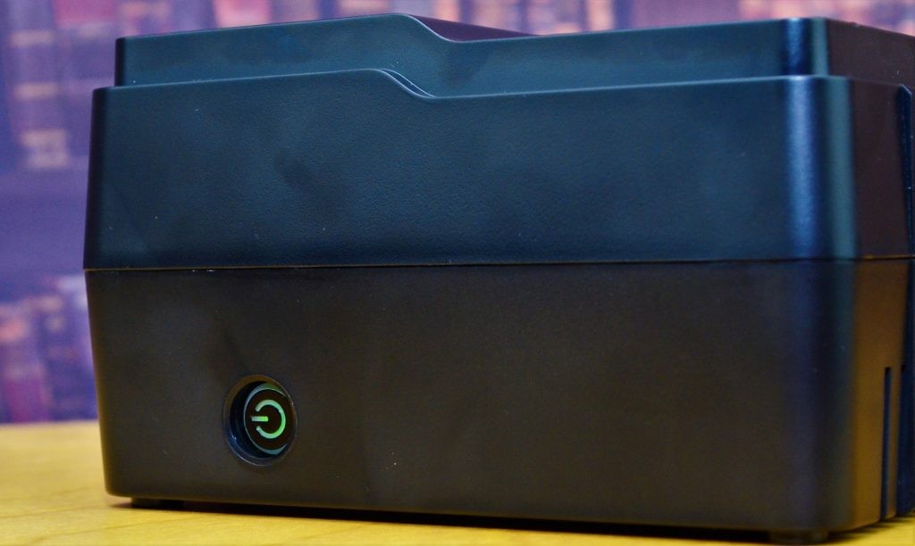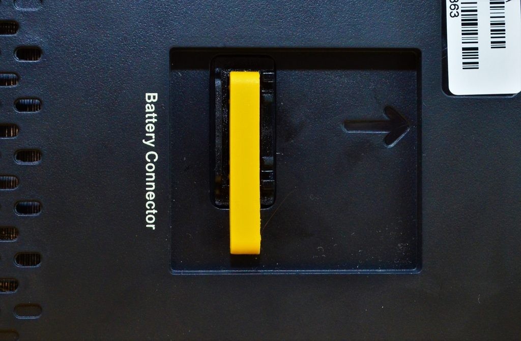 Итак, APC EASY UPS BV BV800I-GR. Все розетки находятся на верхней панели. Одна из них расположена чуть дальше от остальных. Сделано это для подключения приборов с совмещённой вилкой и блоком питания. Также на верхней панели расположена решётка охлаждения. Ещё одна находится на дне устройства. Там же расположен коннектор для первоначальной активации ИБП. Это жёлтый пластиковый «ключ», который надо вставить в расположенное под ним гнездо. И только тогда ИБП заработает в полной мере. Если его не вставить, то устройство будет работать только как сетевой фильтр, т.е. защищать линию от скачков и т.д.
