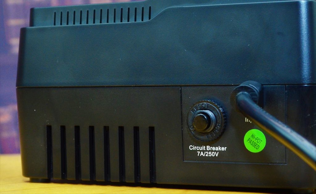 Сетевой шнур выходит из правой торцевой части. Там же находится и автоматический предохранитель на 7А. Это первый барьер для защиты вашего оборудования от короткого замыкания. В случае короткого замыкания предохранитель срабатывает и отключает бесперебойник. Для возобновления работы нужно будет нажать на кнопку, под которой находится предохранитель.