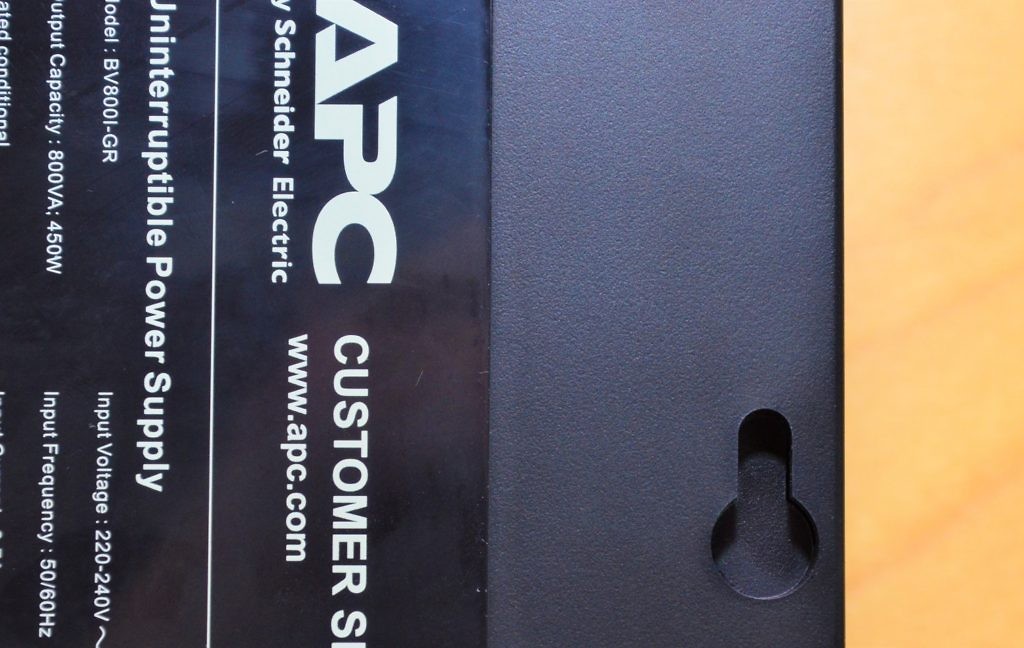 На левом боку находится кнопка включения ИБП. Длина сетевого шнура равняется полутора метрам, что в принципе довольно стандартно для большинства ИБП. Кстати, узнать мощность устройства можно только по данным на наклейке, которая находится на задней стороне. На передней панели имеется лишь стандартная для всех устройств производителя надпись с названием бренда APC и компании Schneider Electric, который принадлежит бренд.